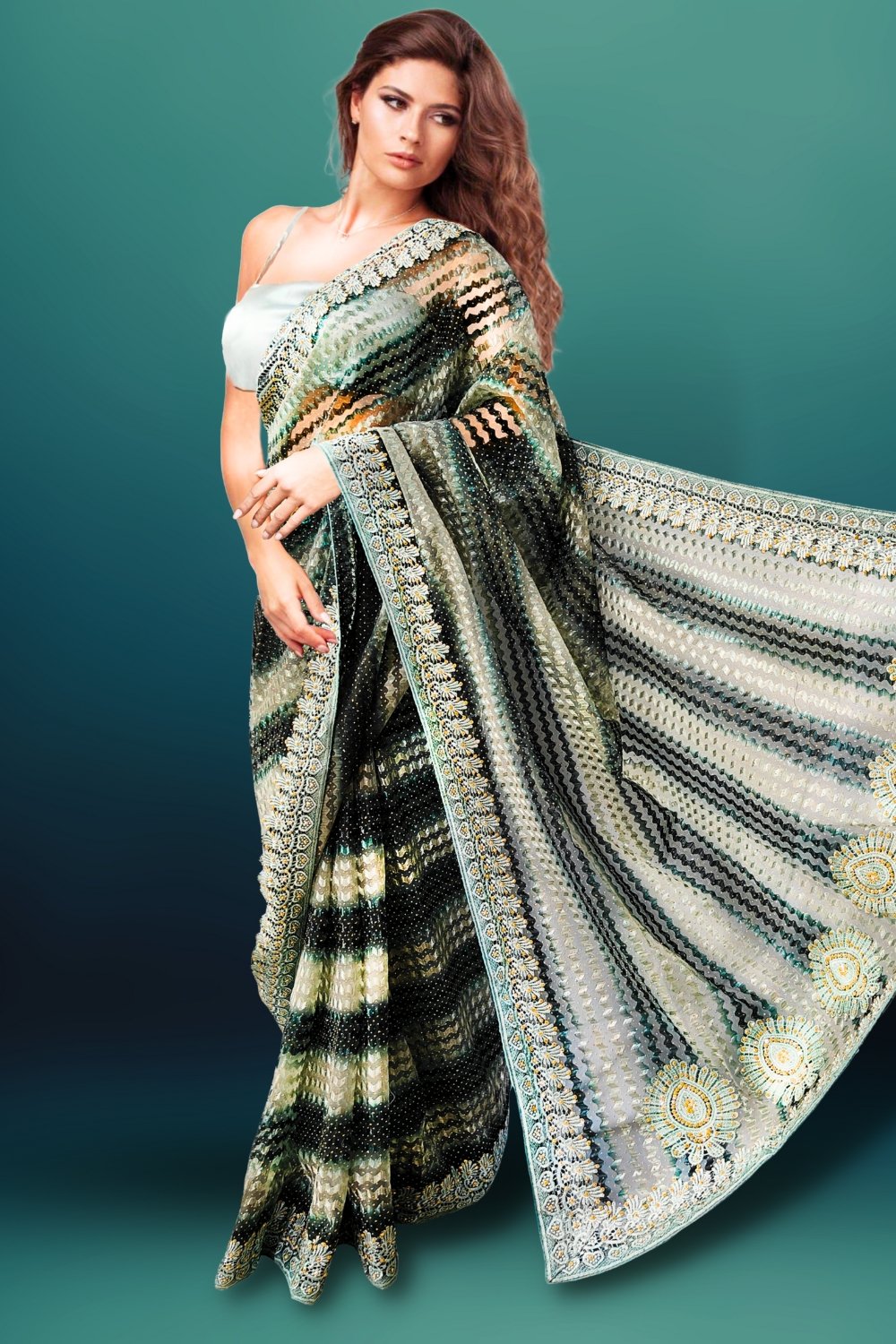 Discover ethereal beauty with our stunning green organza saree, a perfect blend of grace and sophistication.